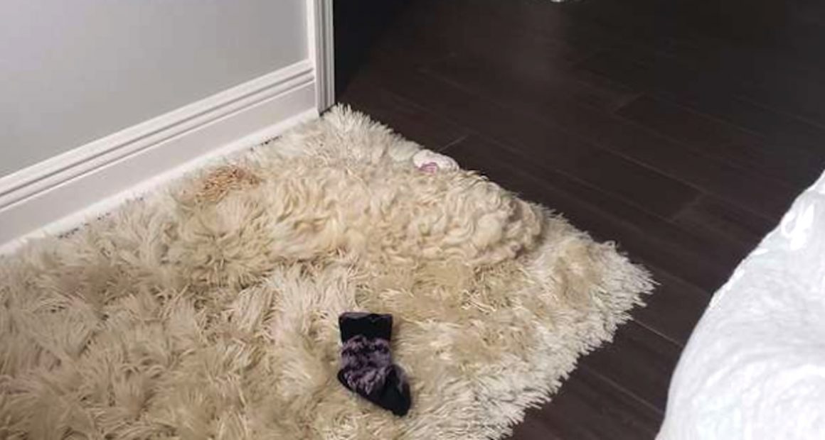 One day, Hoss was falling asleep on her favorite rug when her mother passed by, and she was amazed at how easy it was to lose her in the midst of the fuzz. It was almost invisible! I took a picture and shared it on Facebook to see if anyone could spot it…