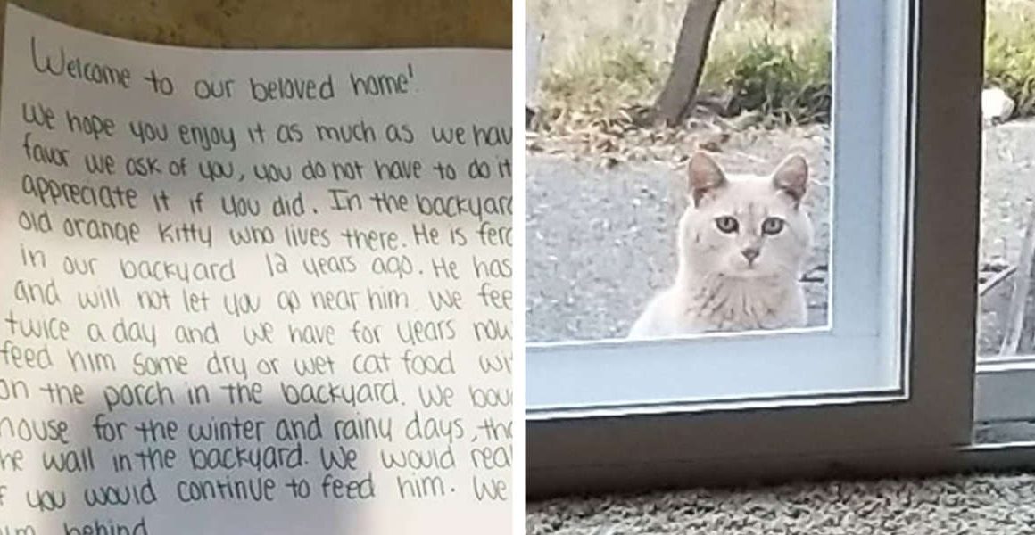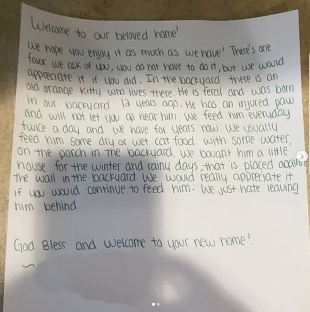 “In the garden there is an old orange cat that lives there,” the note continues. “He’s a savage and he was born in our garden 12 years ago. He has an injured claw and won’t let you near him. We feed him (everyday) twice a day and we have him for years.”