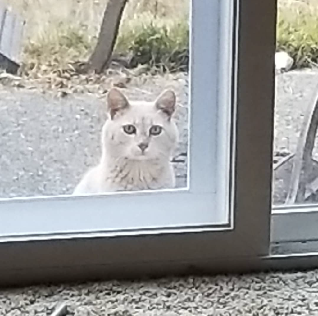 Image of a cat looking at another cat through the window