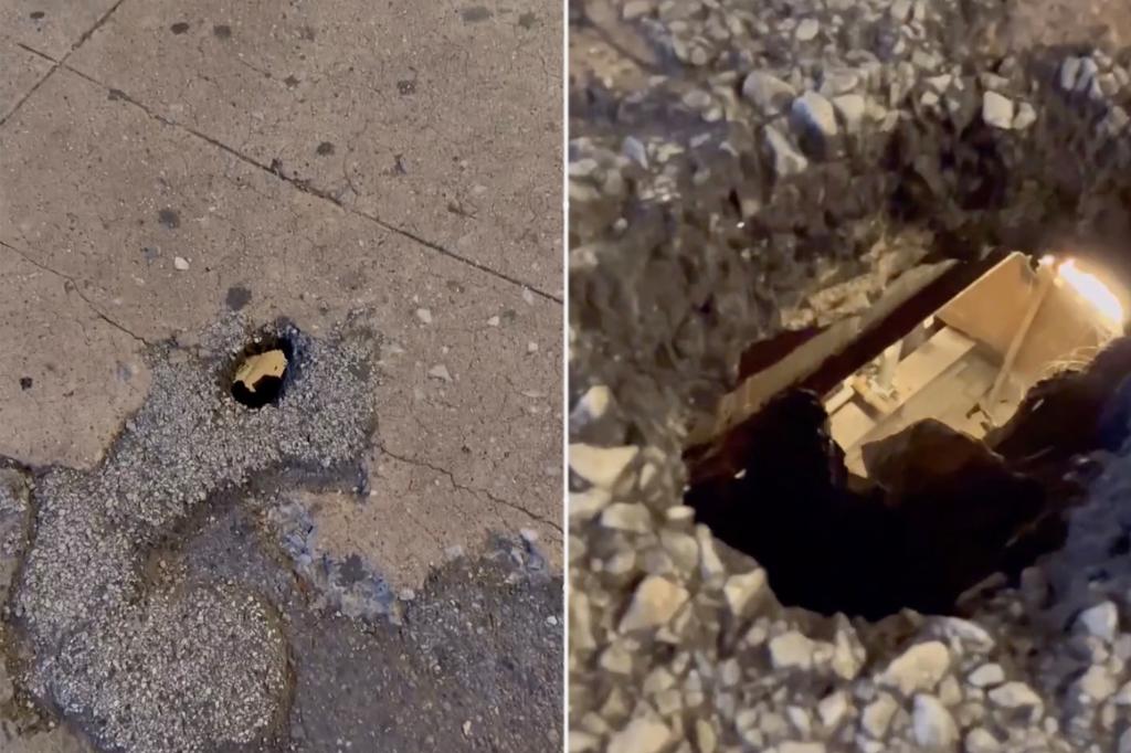 A crack opened on a crumbling sidewalk near Battery Park, briefly giving passersby a peek into the subway below — and a startling reminder of how thin the ground above really is.