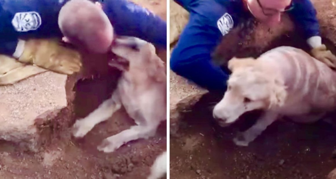 Soon the firefighters arrived. After assessing the situation, they decided the best way to get Quinn out of the hole was to dig to make more space. In about twenty minutes, they were able to widen the hole just enough to get the dog out himself.