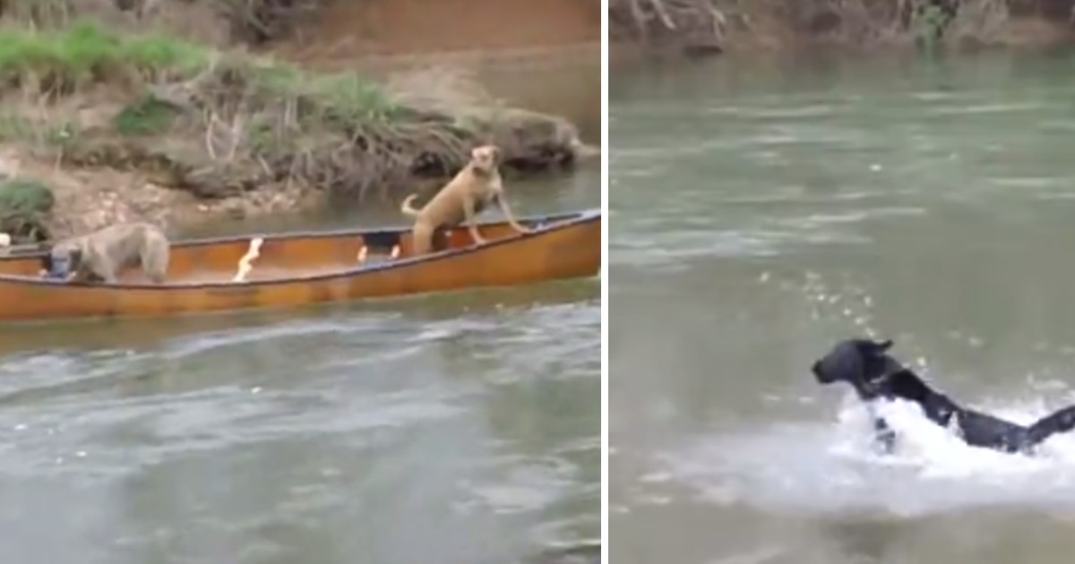 Two Labradors found themselves in danger when the boat they were in managed to break free and begin to descend downstream. The dogs looked somewhat panicked as they stood in the boat, looking for anyone who could save them.
