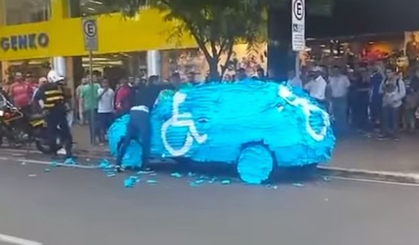 A reckless driver in Brazil was pulled over at one o’clock and on his return found his whole car covered in bright blue paper. A white sticker makes a wheelchair sign on the side of his vehicle.